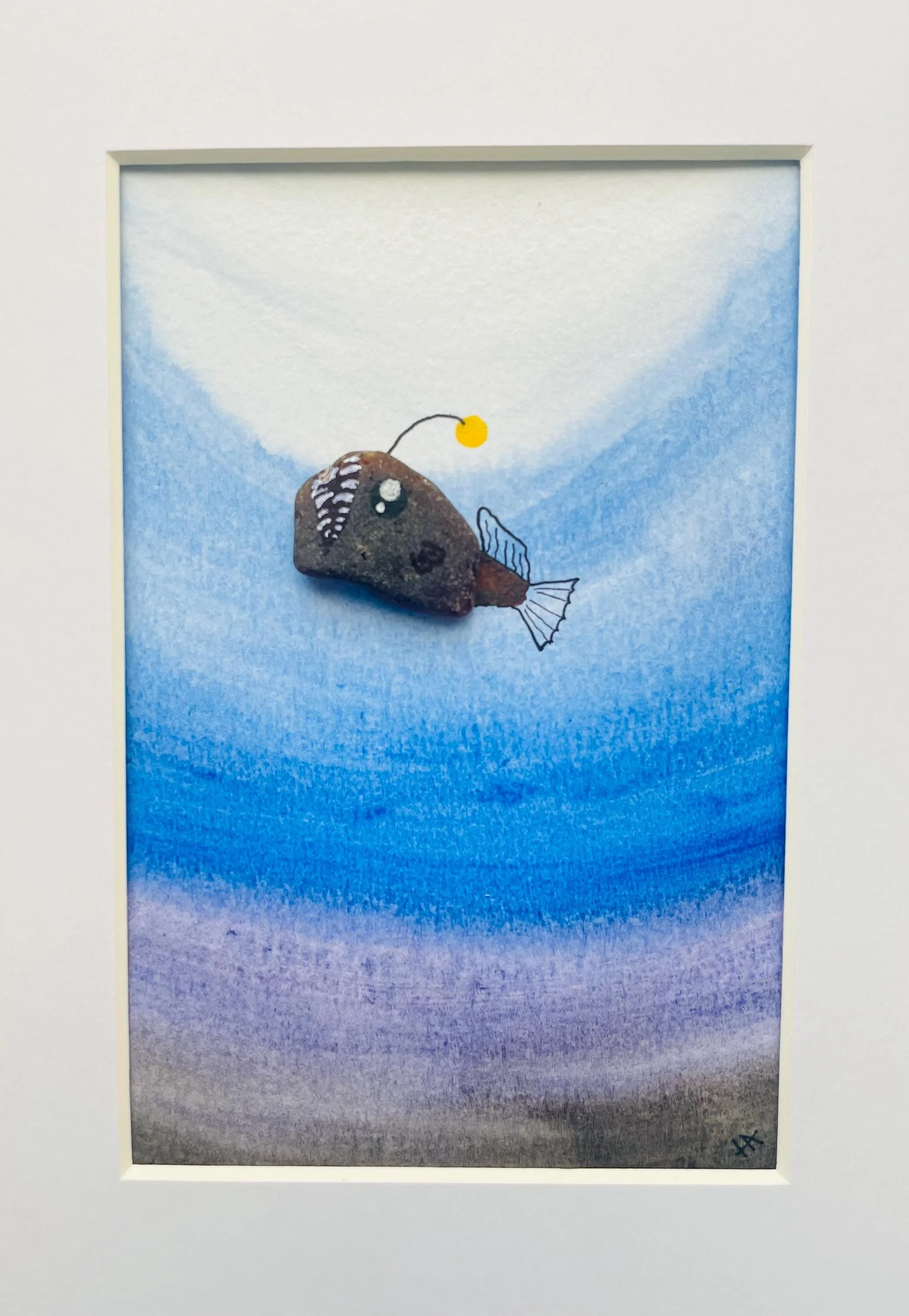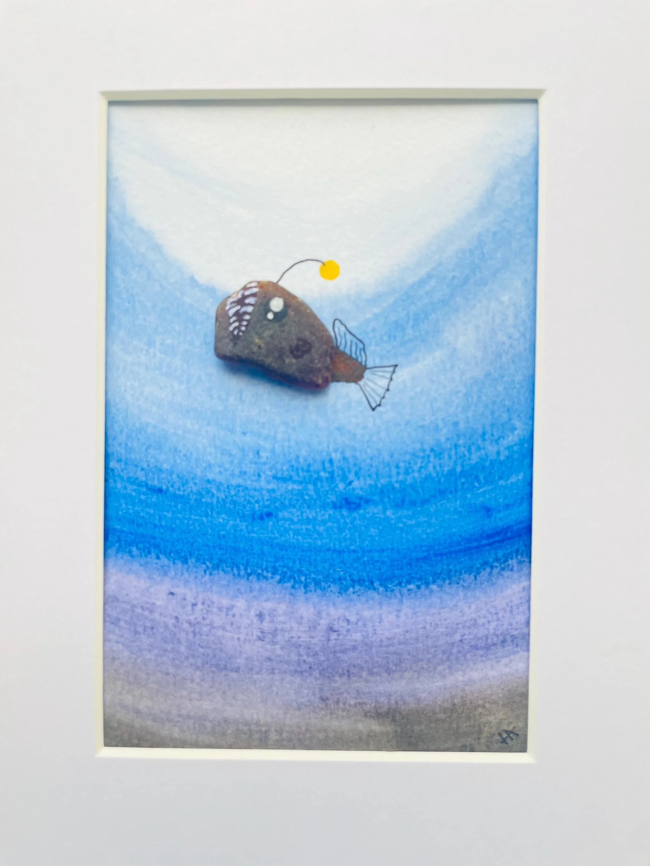The little angler fish that could, grabbed the hearts of many as she proved that you can do anything if you just believe in yourself. The sea glass piece has a hand-painted watercolor background and can be matted or framed.